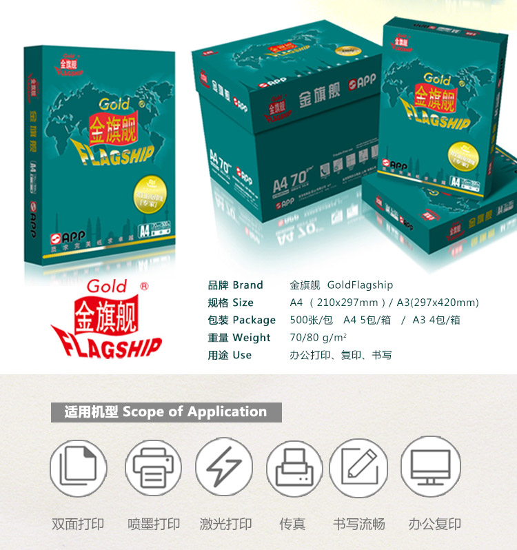 金旗舰复印纸70G A4 500S 5包/箱