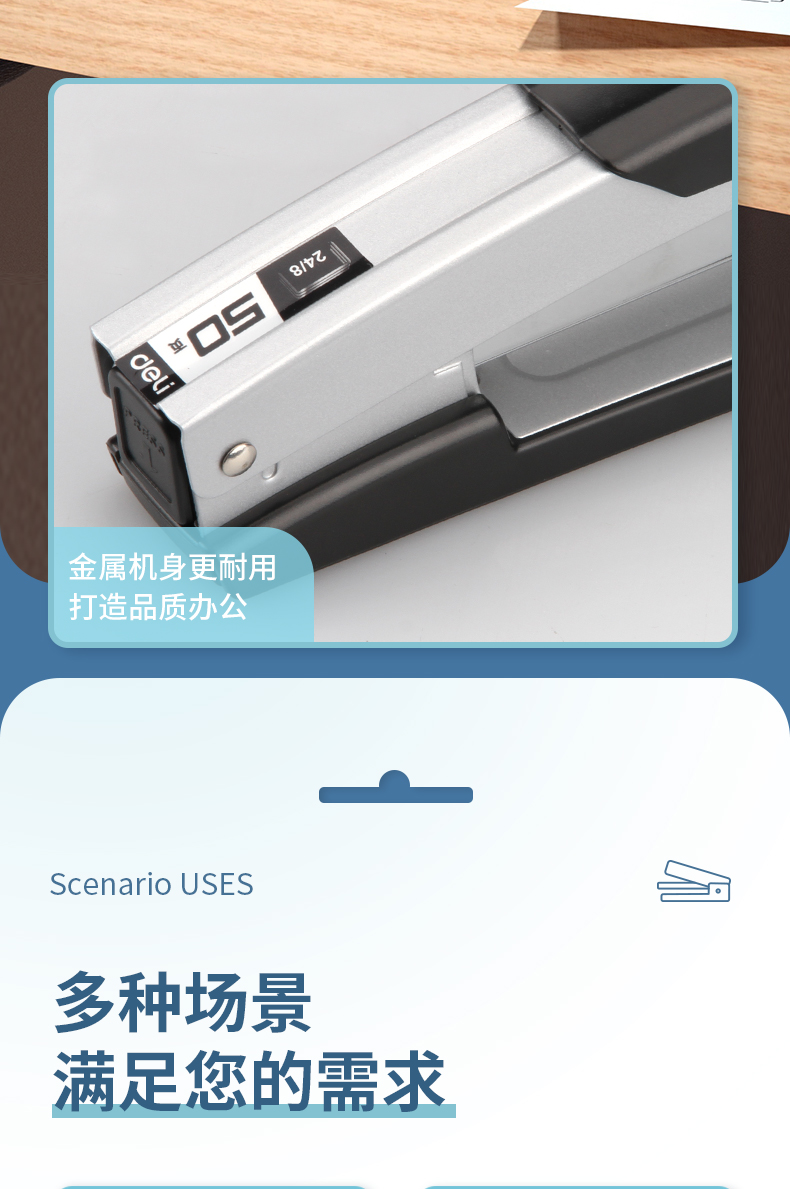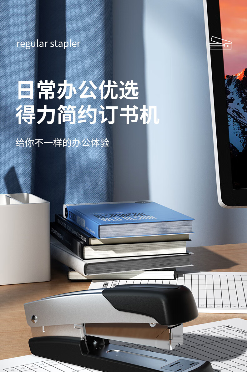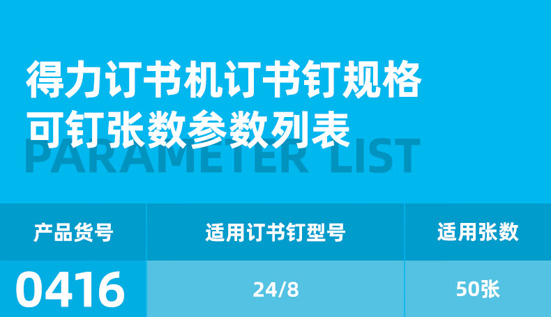 得力(deli)轻便型厚层订书机/订书器 金属材质可钉50页 银色0416