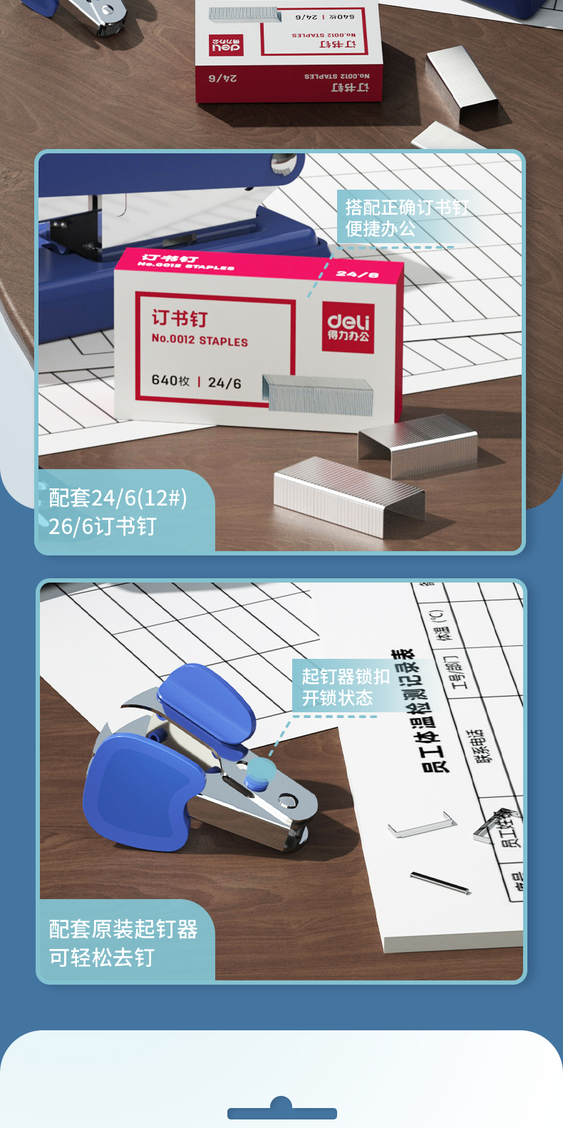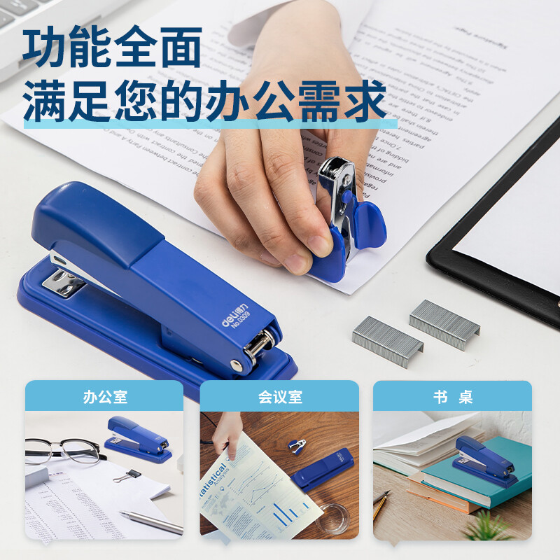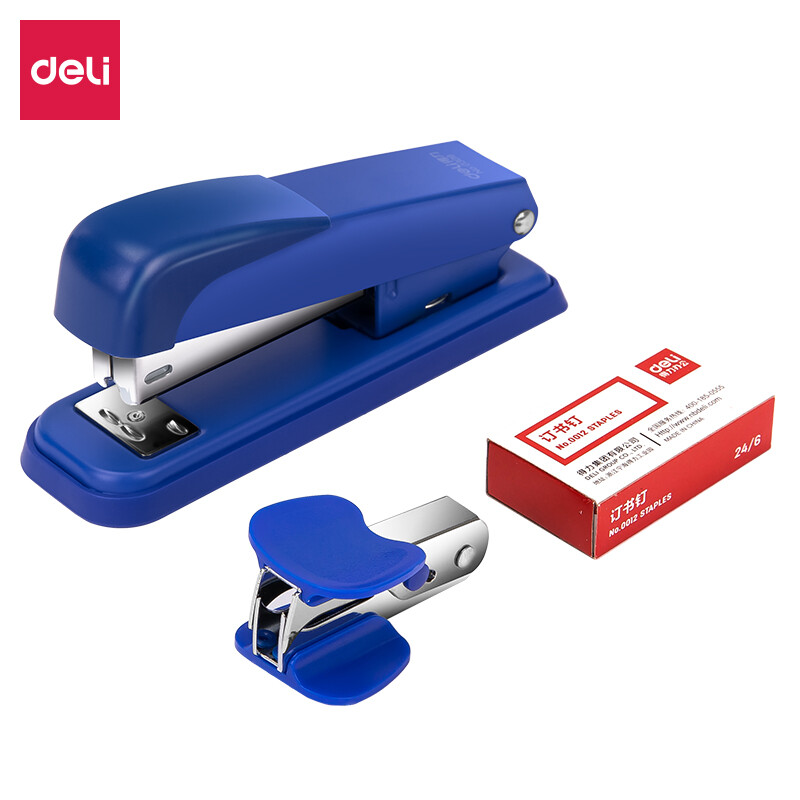 得力(deli)订书机三件组合套装(订书机+订书钉+起钉器) 订书器 蓝色0359