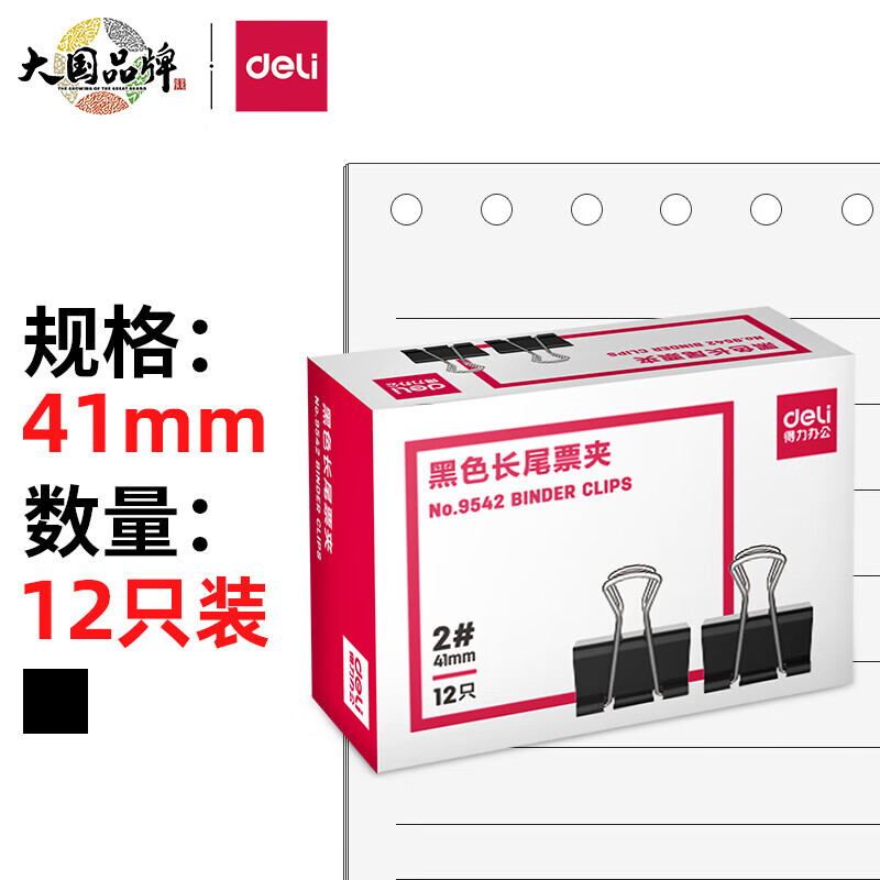 得力(deli)41mm大号黑色长尾夹/燕尾夹/2# 12只/盒