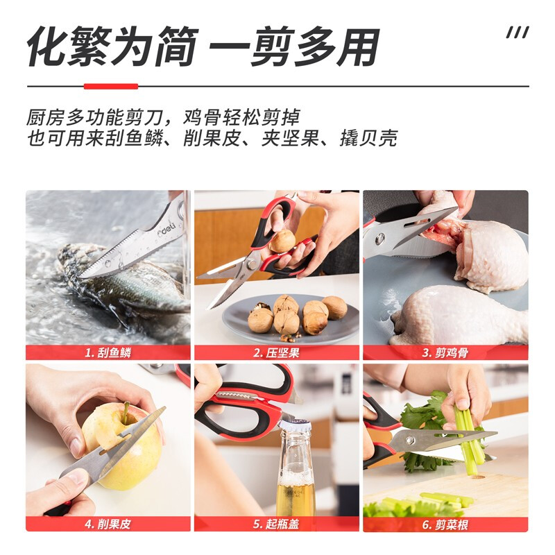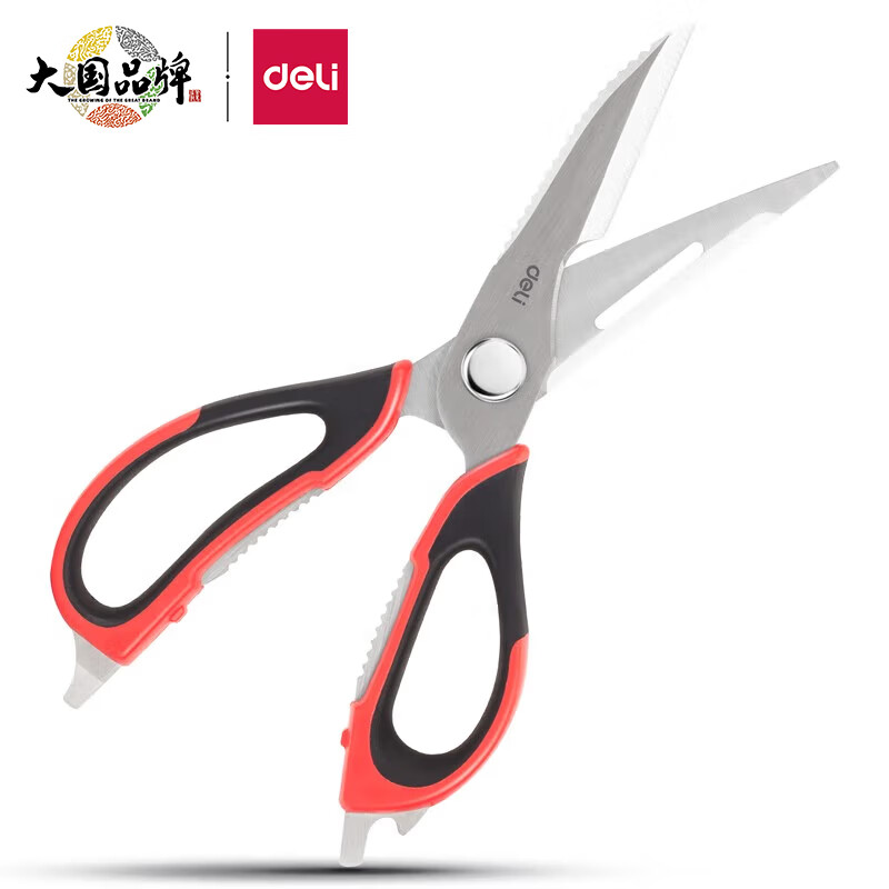 得力(deli)多功能厨房剪刀 食物专用剪刀 锯齿防滑可拆分易清洗 红色77770