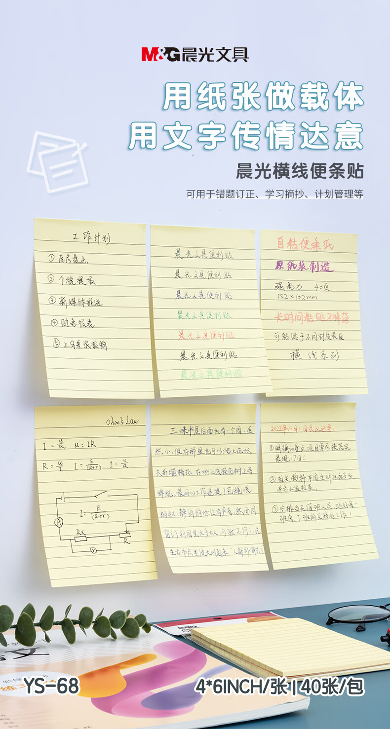 晨光(M&G)文具横线便利贴 可粘便签纸优事贴错题贴 大号笔记贴高颜值手账便签本 152*102mm/单本装YS-68
