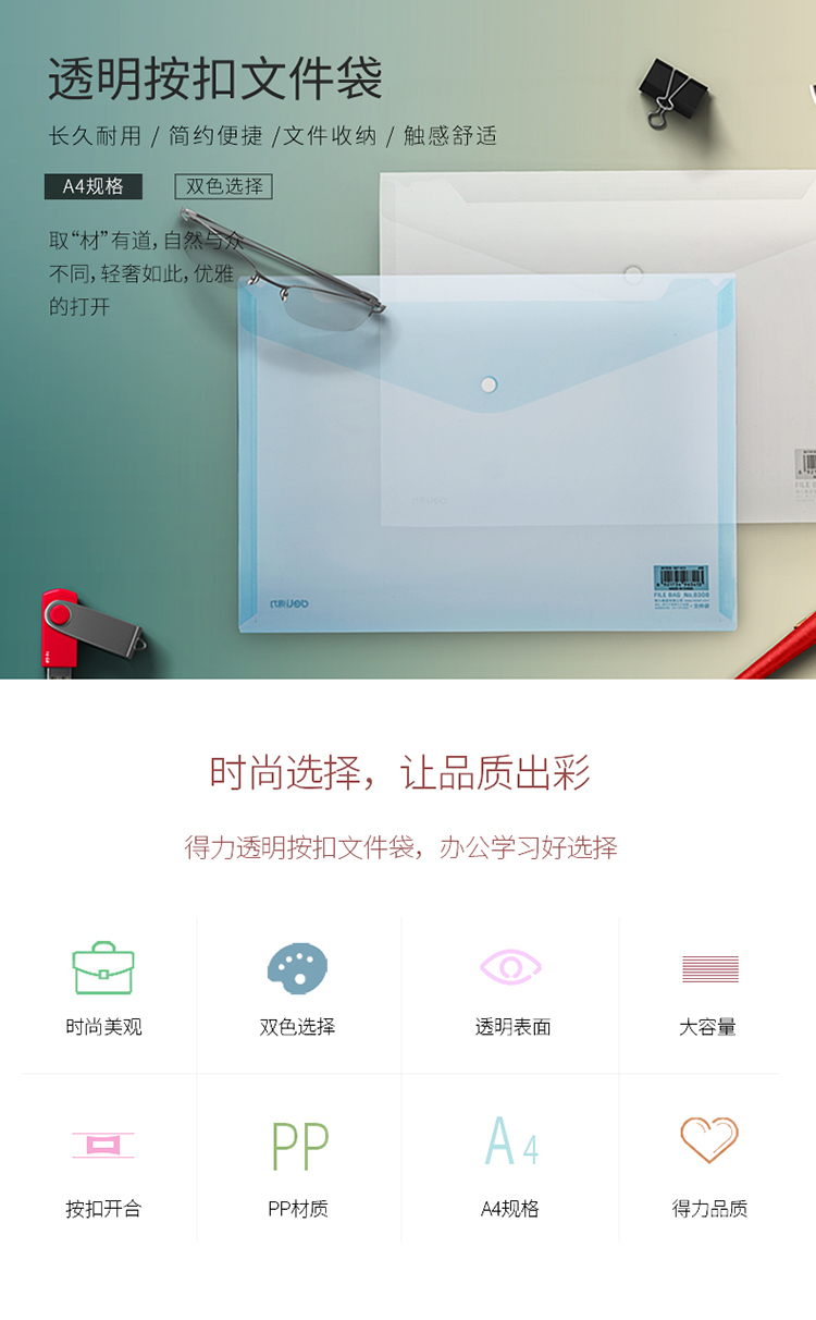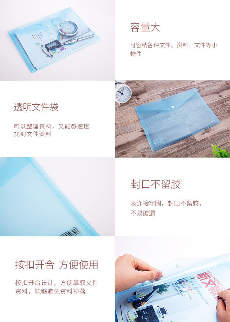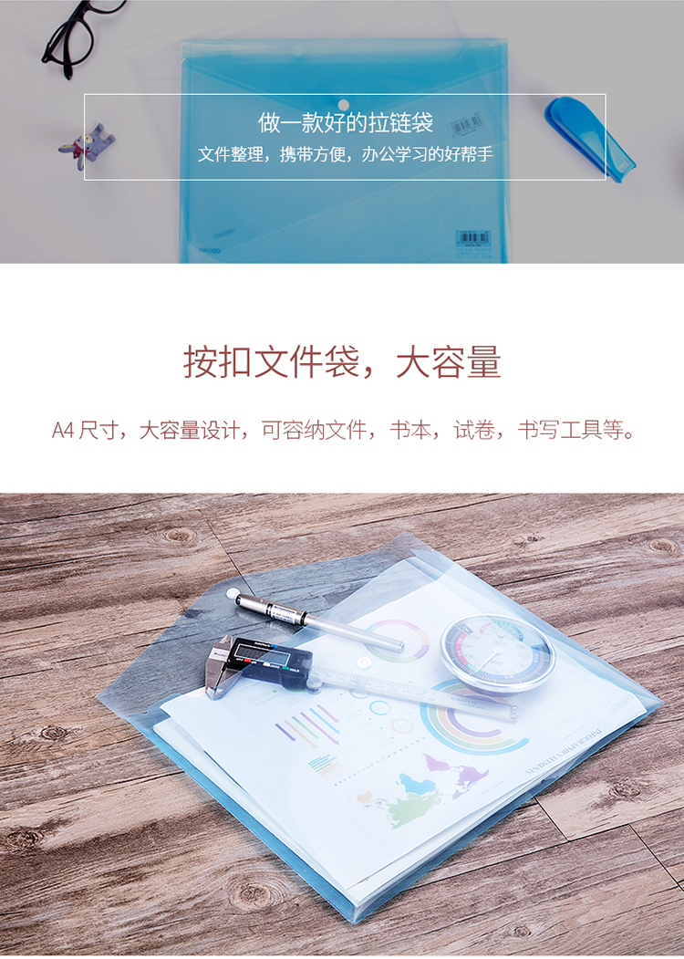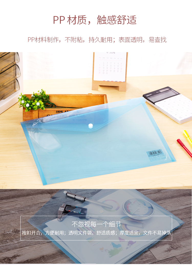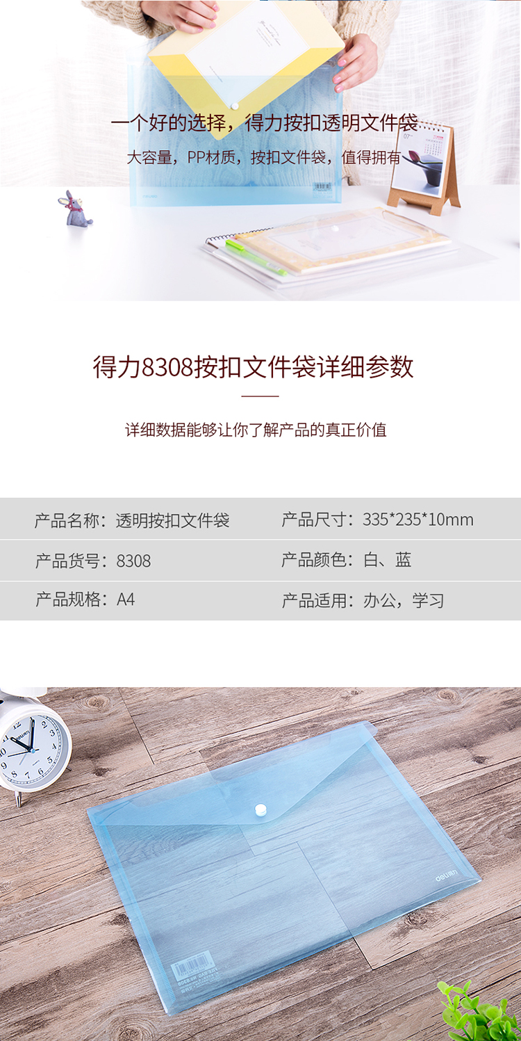 得力(deli)A4透明文件袋 按扣资料袋 塑料档案袋 试卷票据收纳袋 8308蓝色