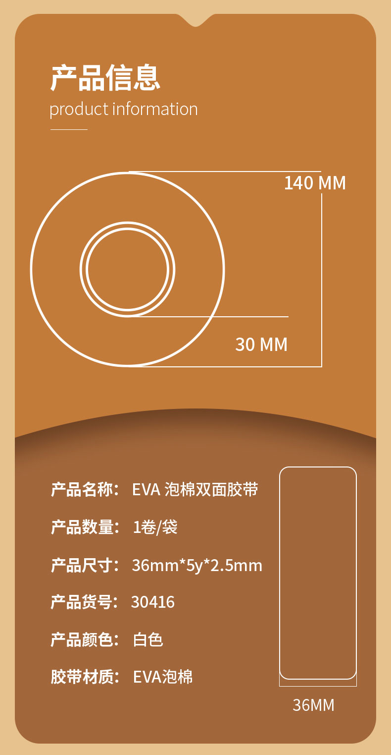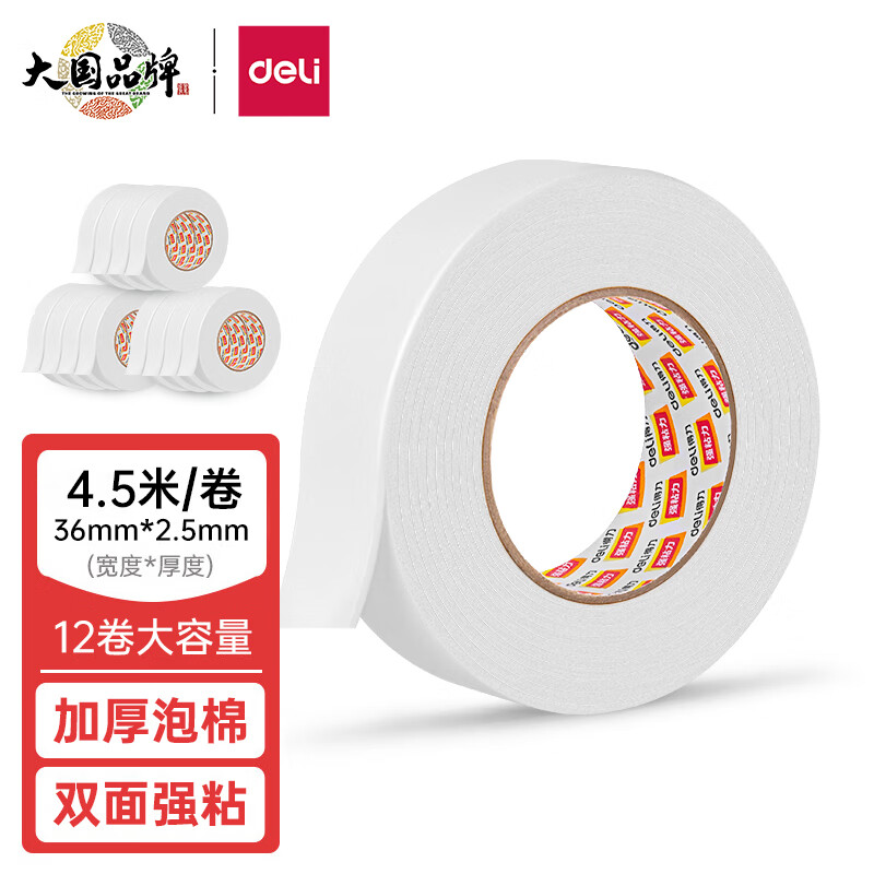 得力(deli)强力高粘度EVA泡棉双面胶带 36mm*5y*2.5mm/卷 白色30416