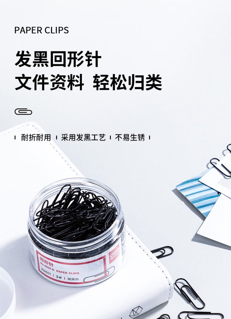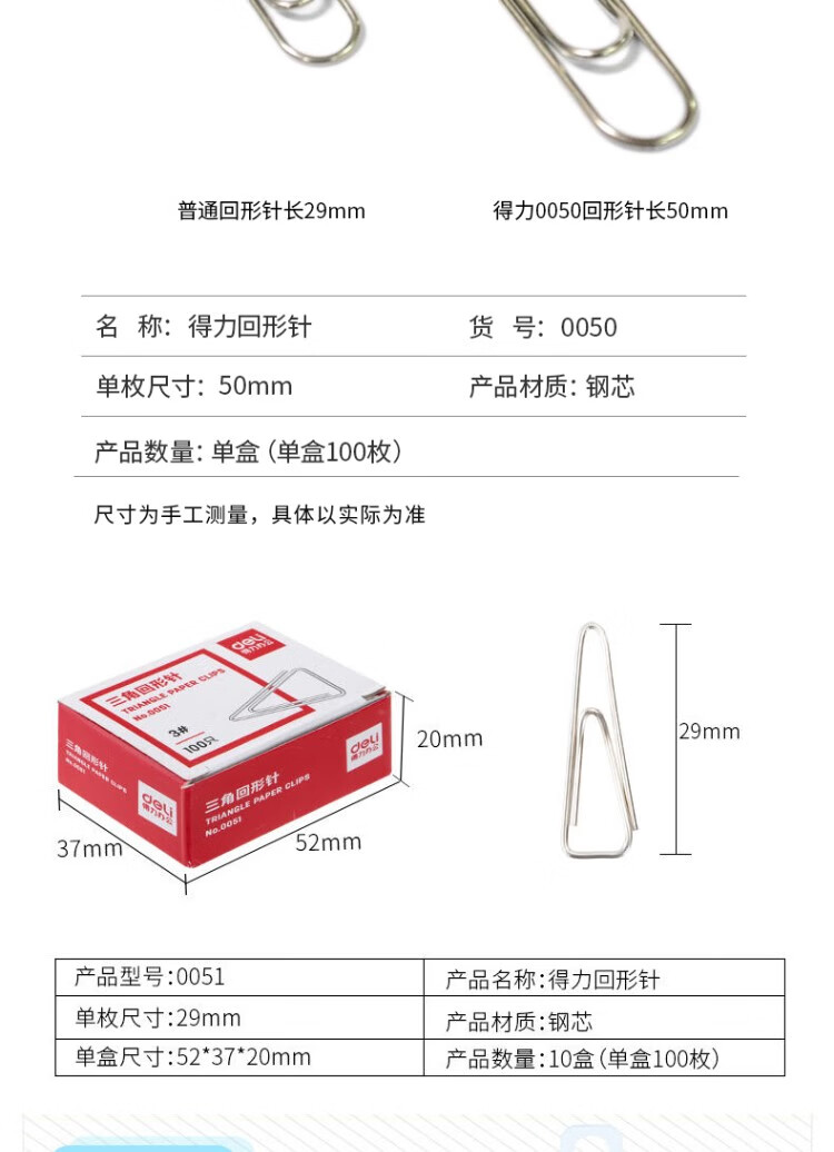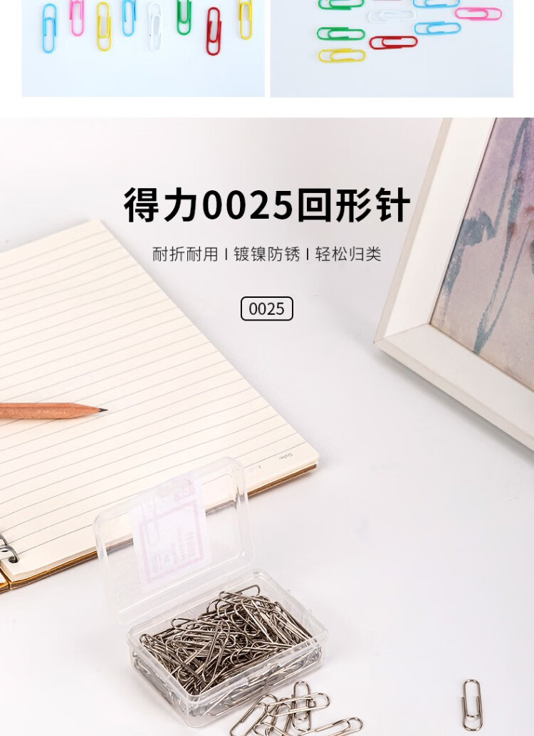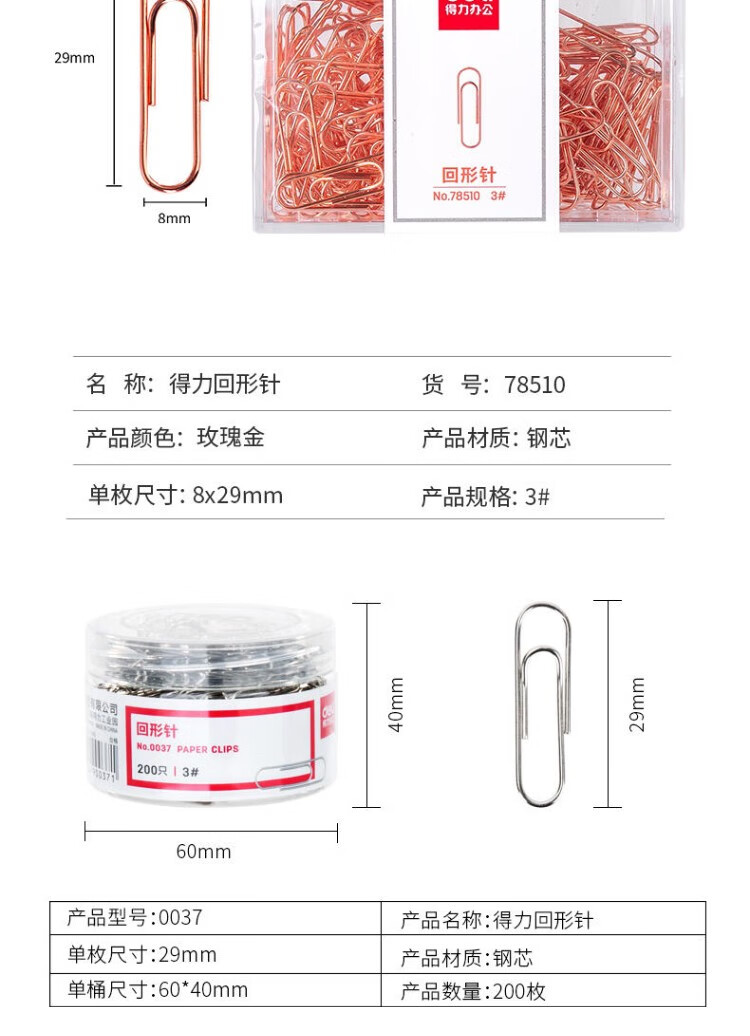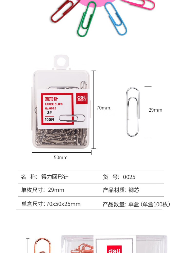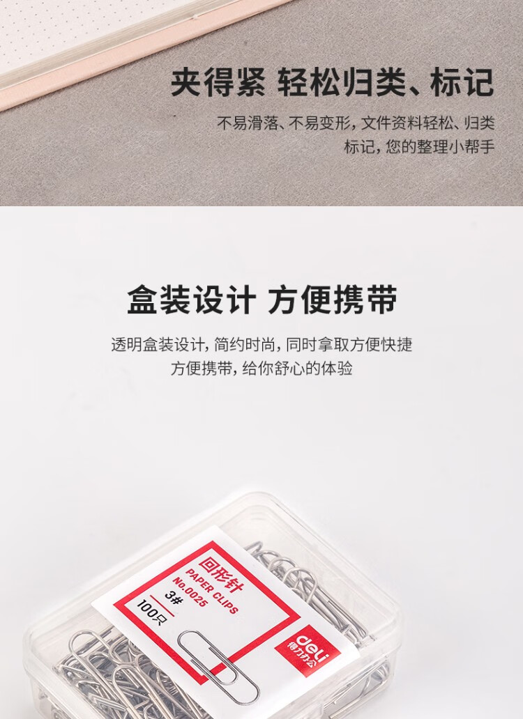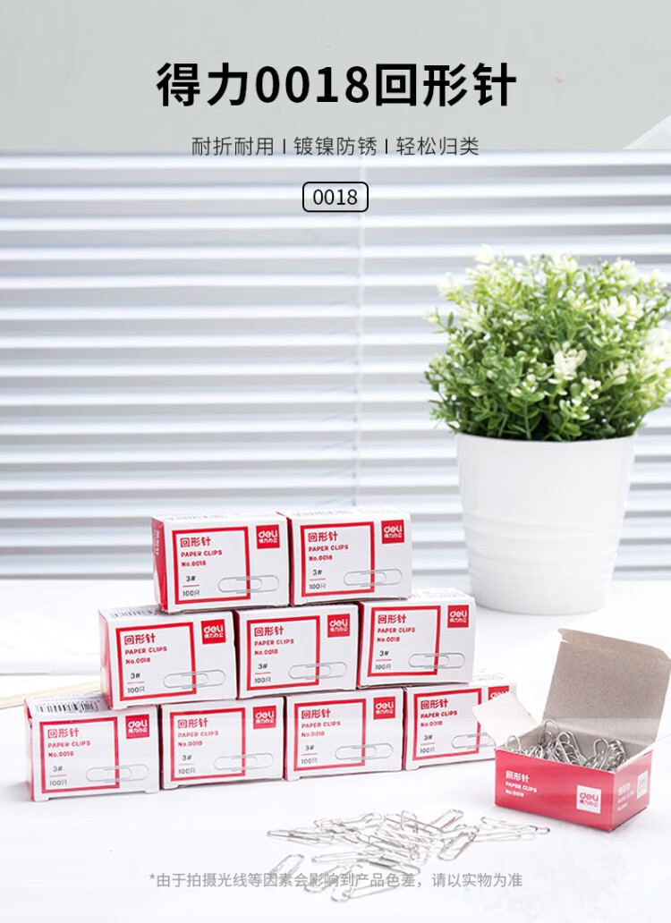 得力(deli)防锈回形针镀镍50mm 8#(100枚/盒)0050