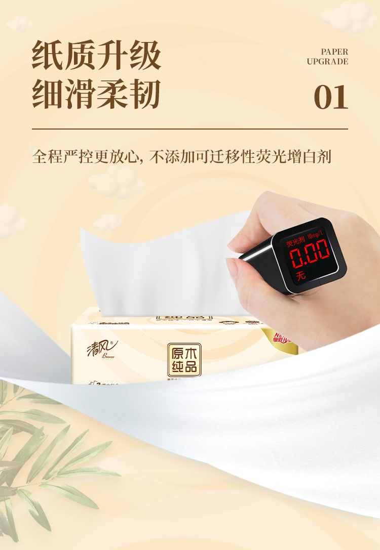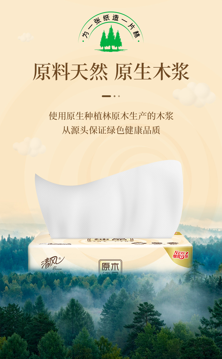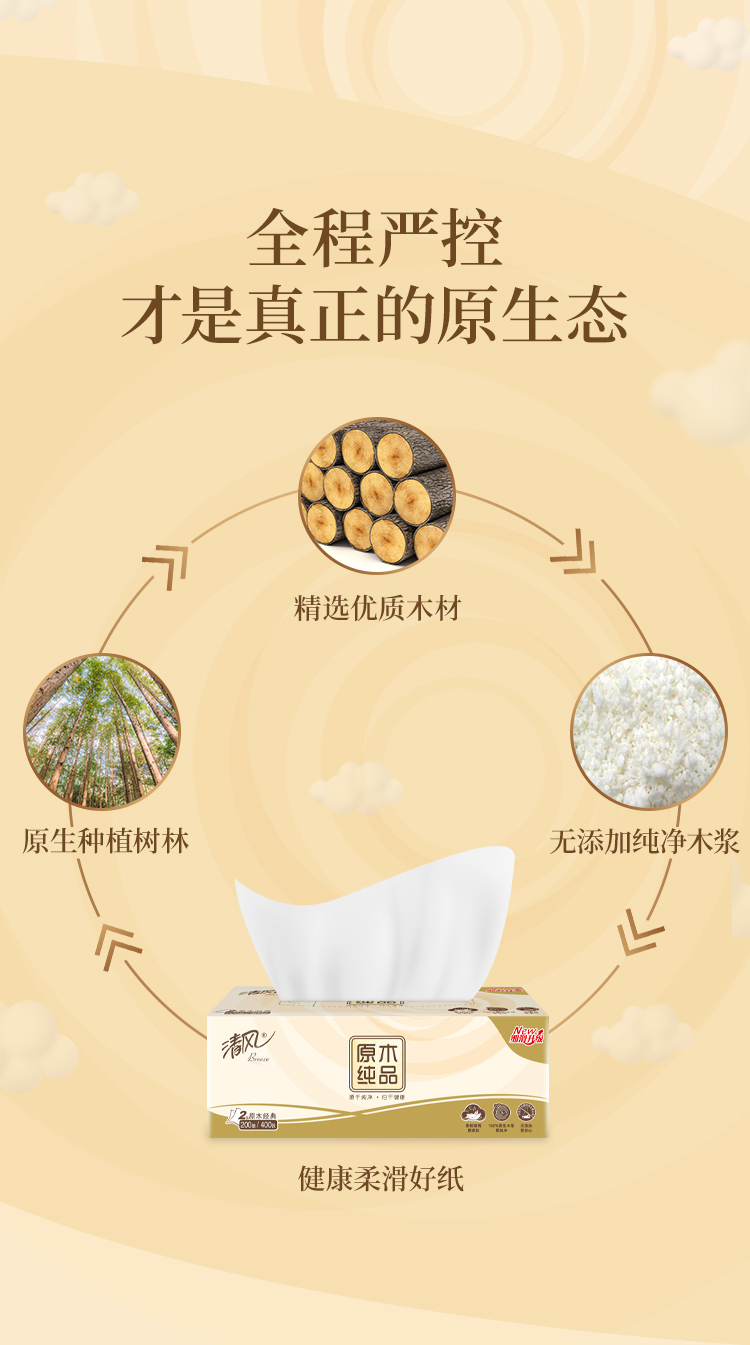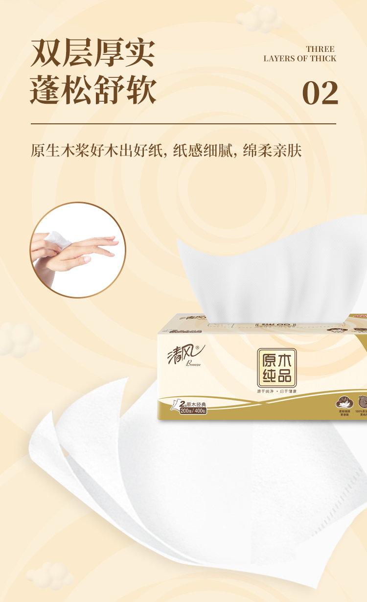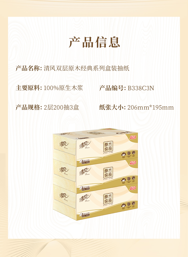 清风原木纯品200抽2层盒装面巾纸 抽纸 纸巾B338C3N