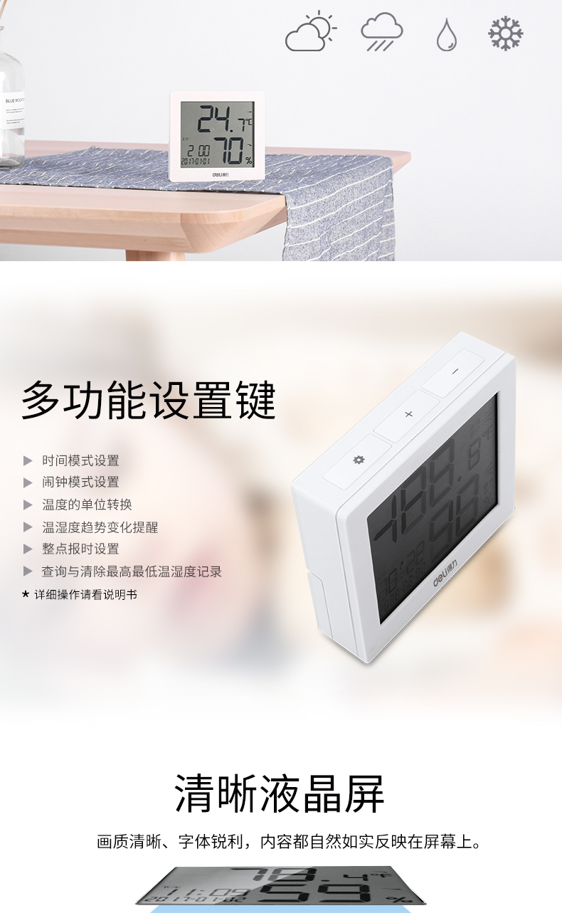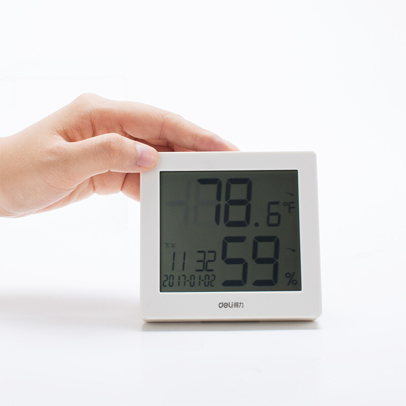 得力(deli)LCD带时间闹钟电子温湿度计 白色8813