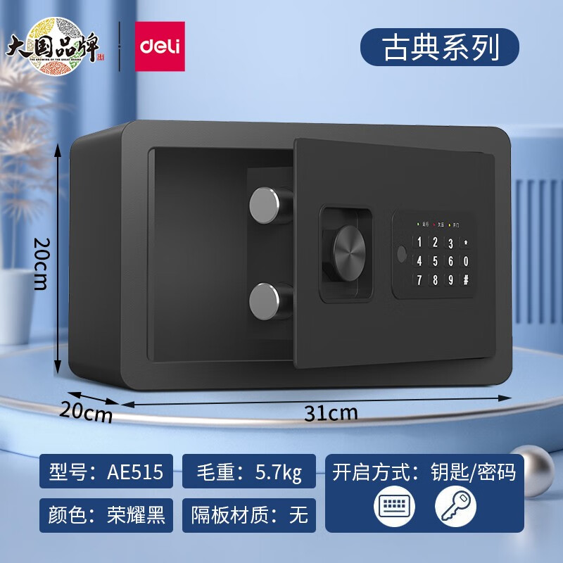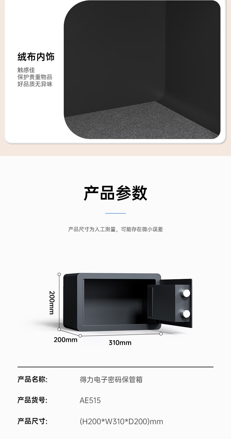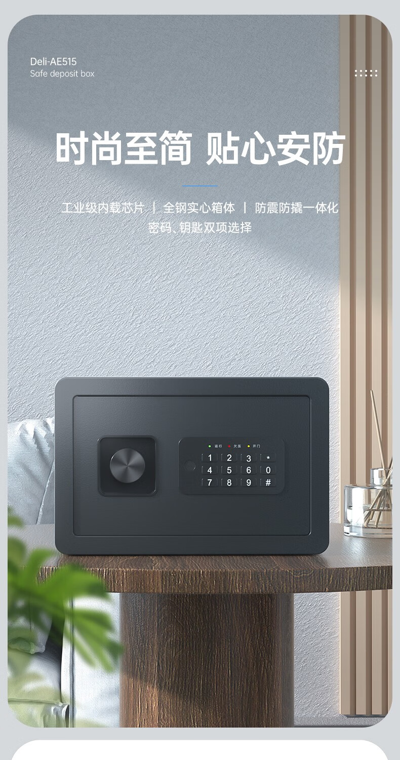 得力(deli)全钢结构电子密码保管箱 办公家用防盗 小型隐形保管柜 可入墙 高20cm 【黑色】AE515