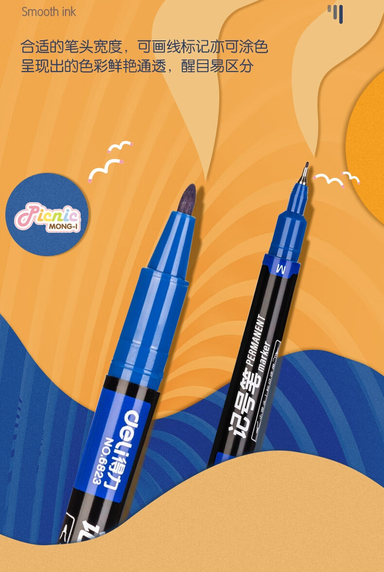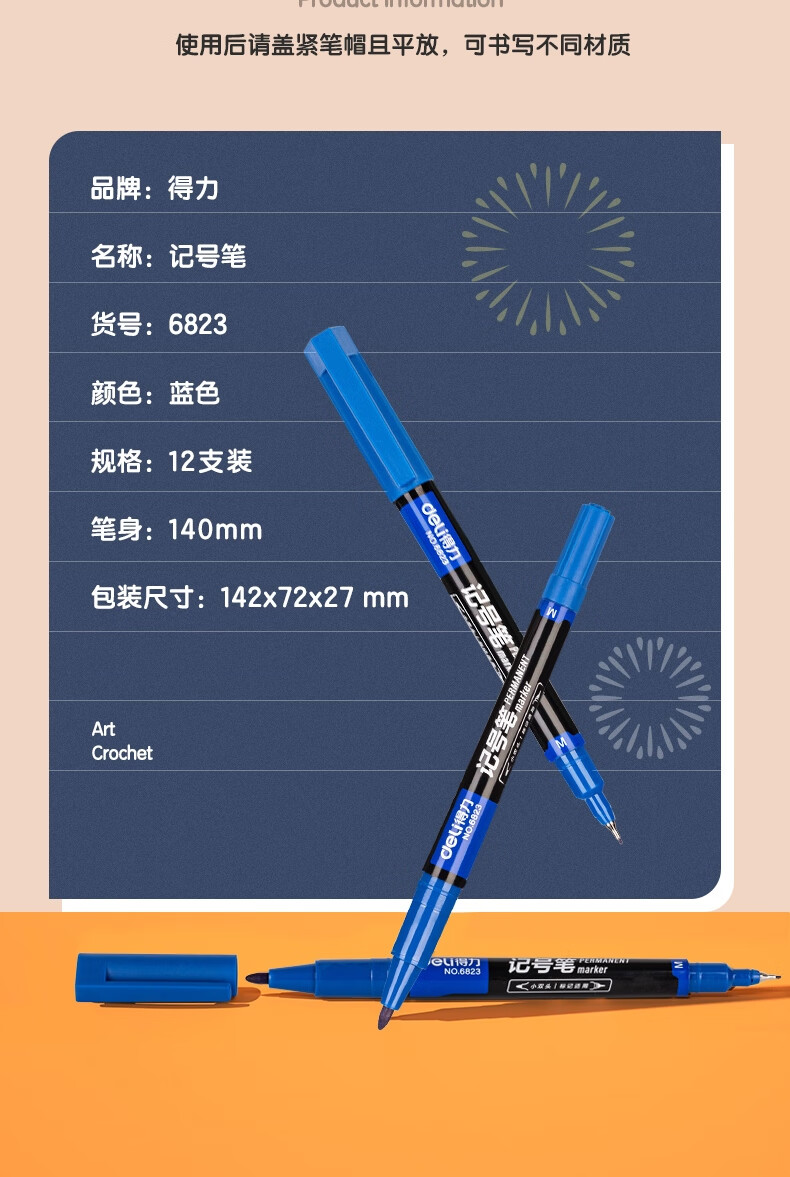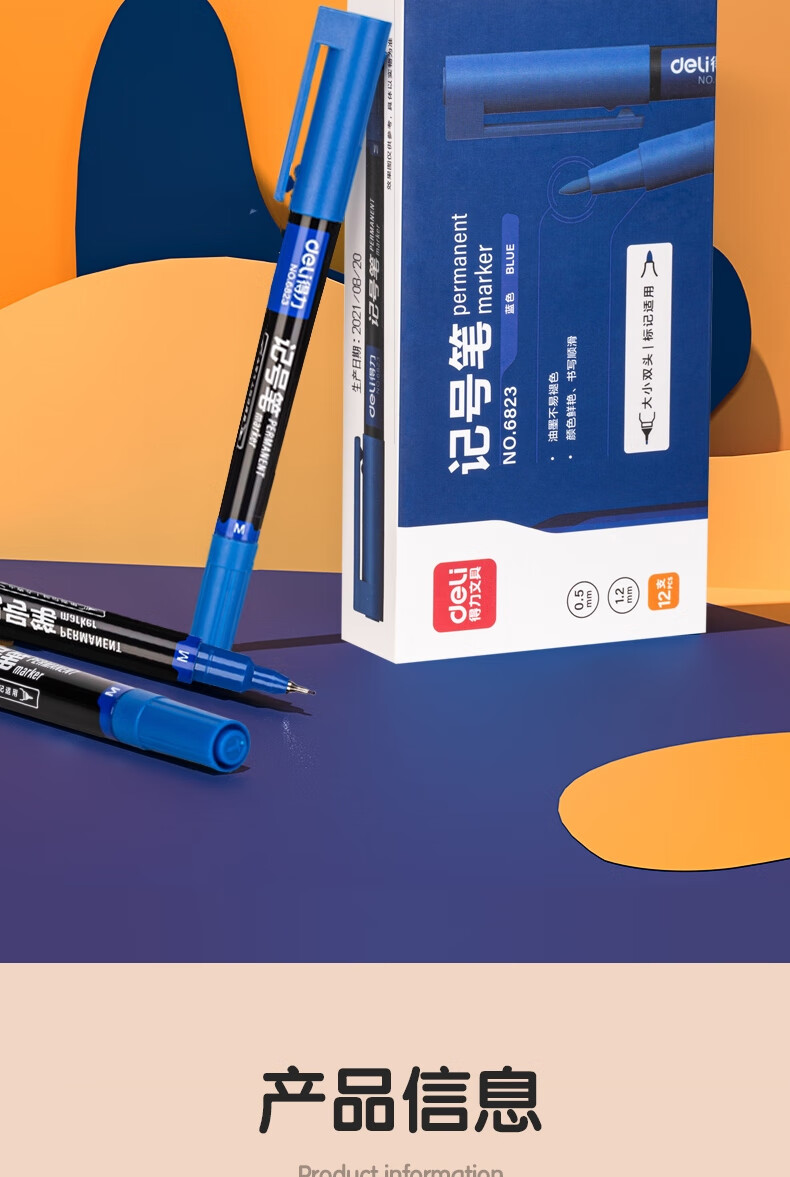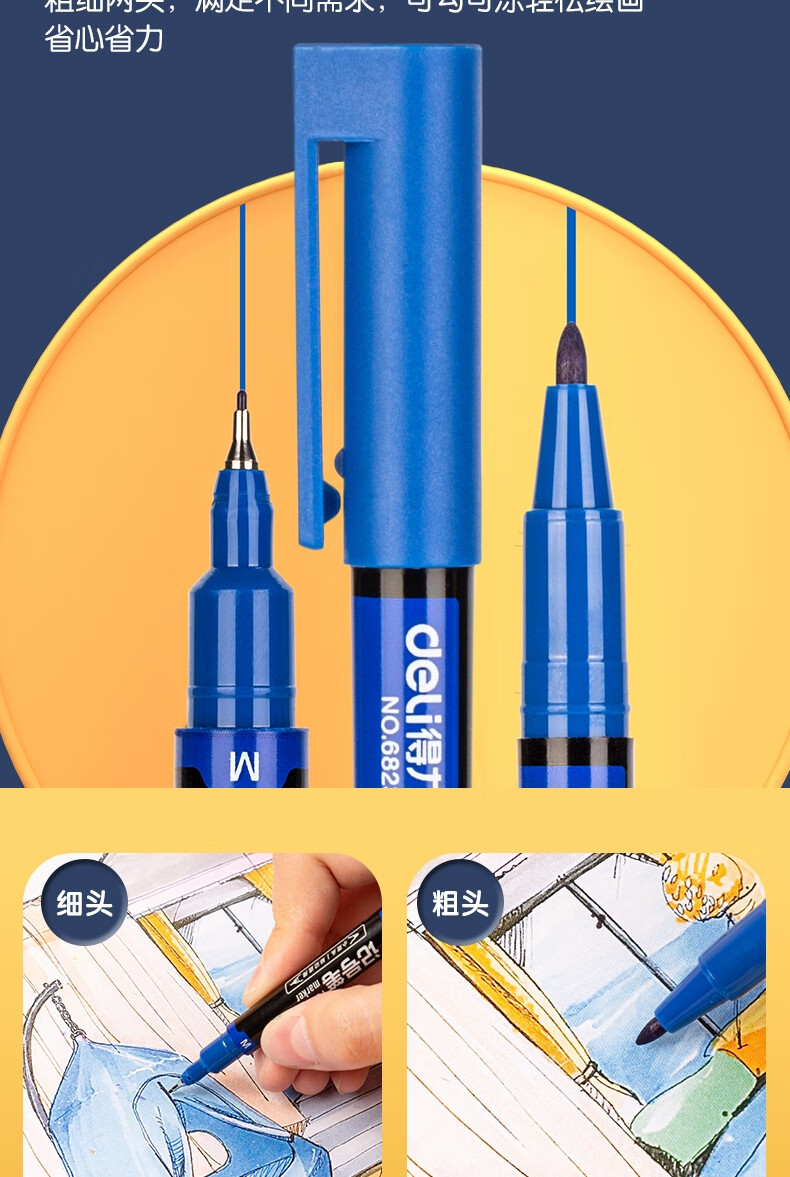 得力(deli) 小双头多用记号笔签字笔 勾线笔会议笔马克笔 双头勾线笔儿童学生 12支/盒 蓝色 6823