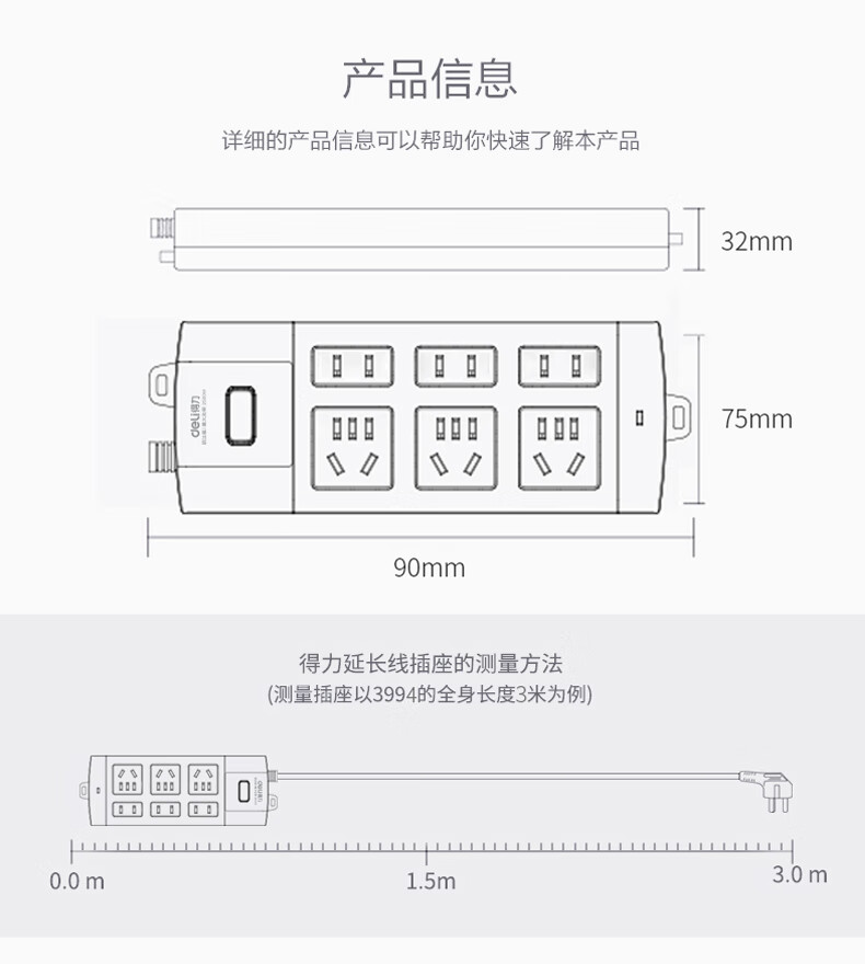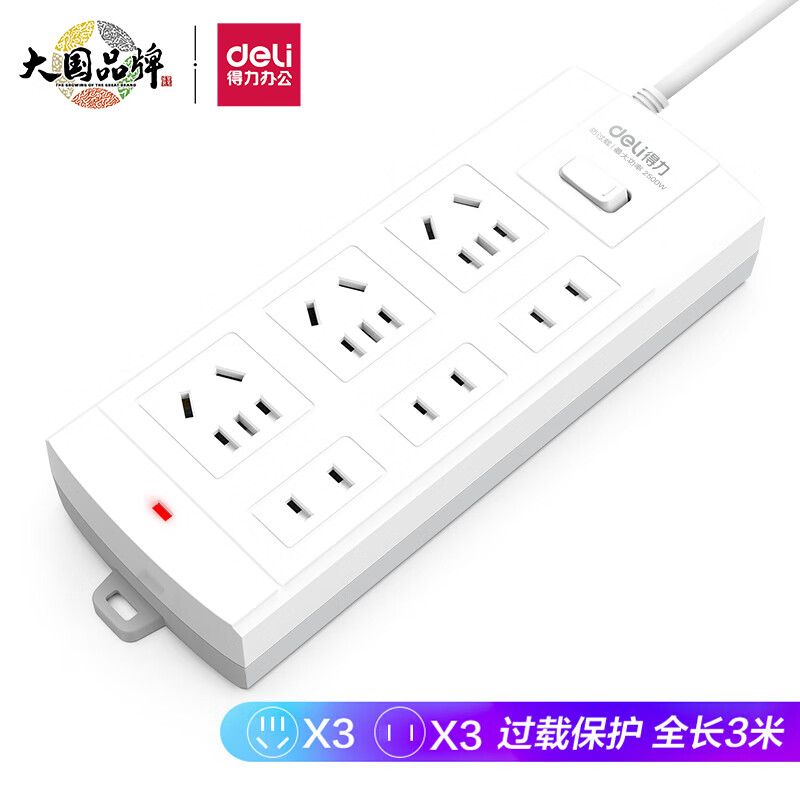 得力(deli)新国标安全插座 过载保护/儿童保护门 6位3米LX23-03