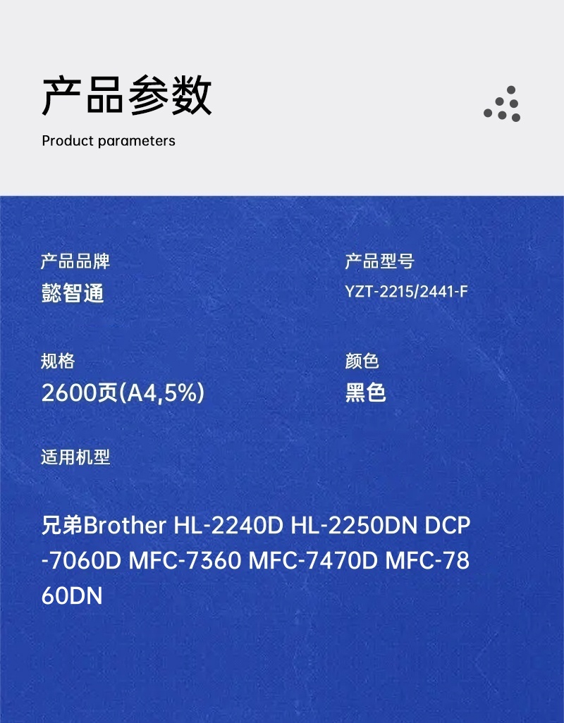 懿智通YZT TN2215/2441高容黑粉-2.6K 单支装(适用兄弟Brother HL-2240D HL-2250DN DCP-7060D MFC-7360 MFC-7470D MFC-7860DN)