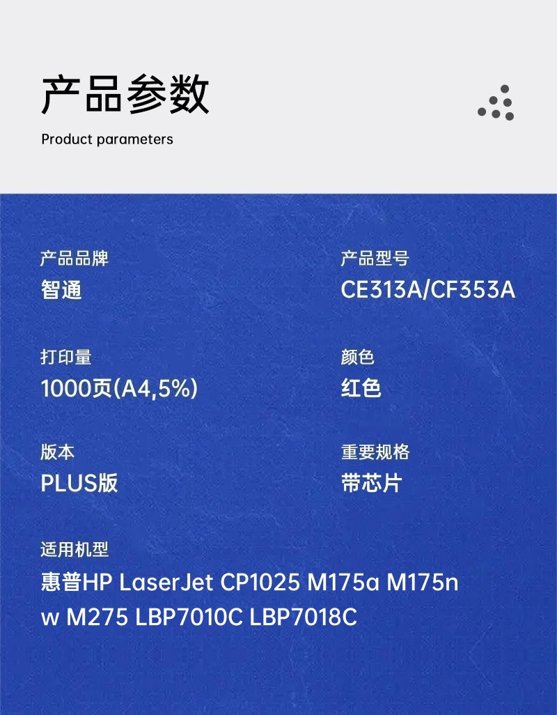 智通 CE313A/CF353A 粉盒 PLUS版 带芯片 红色 1000页(A4,5%)单支装(适用惠普HP LaserJet CP1025 M175a M175nw M275 LBP7010C)