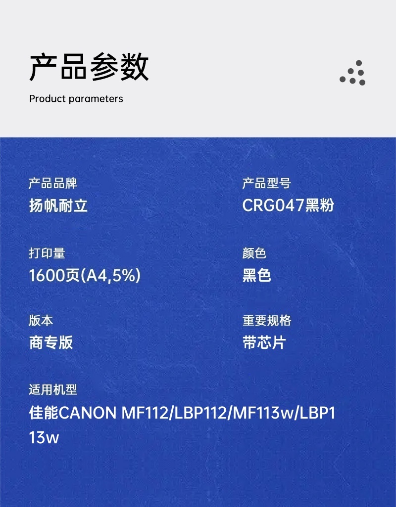 扬帆耐立 CRG047 粉盒 商专版 带芯片 黑色 1600页(A4,5%)适用佳能CANON MF112 LBP112 MF113w LBP113w