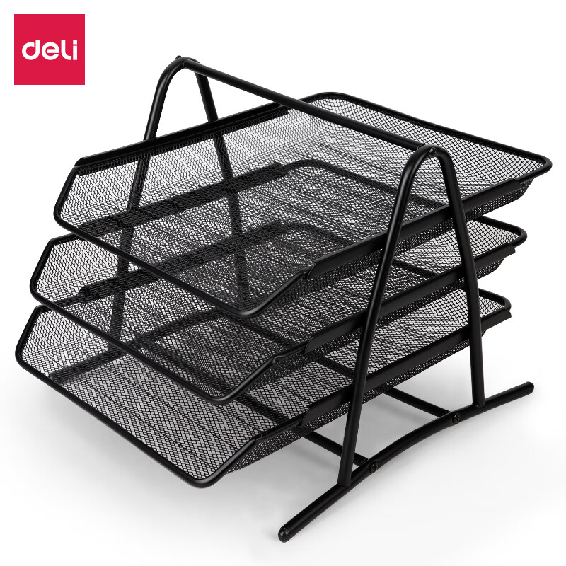 得力(deli)三层金属文件盘 托盘可前后移动 高品质文件座 黑9181