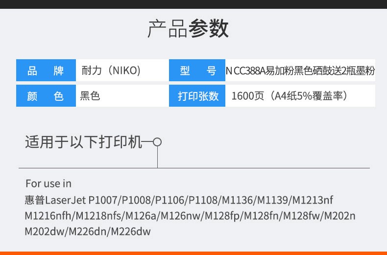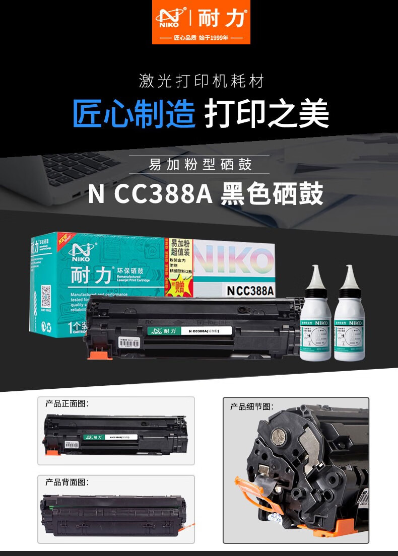耐力(NIKO)N CC388A易加粉+2瓶墨粉 黑色硒鼓 (适用惠普 LaserJet 1007/1008/M1136/M1213nf/M1216nfh)