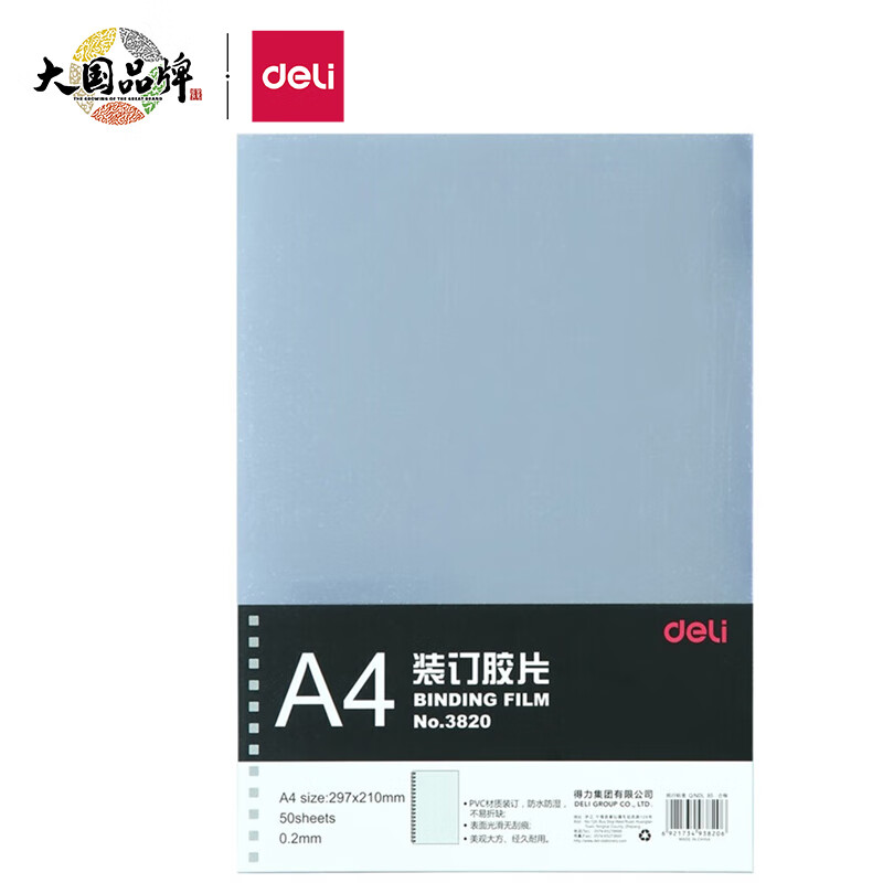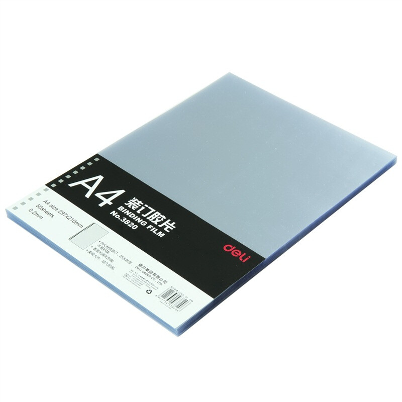 得力(deli) A4装订胶片透明装订封面 50张/袋 3820