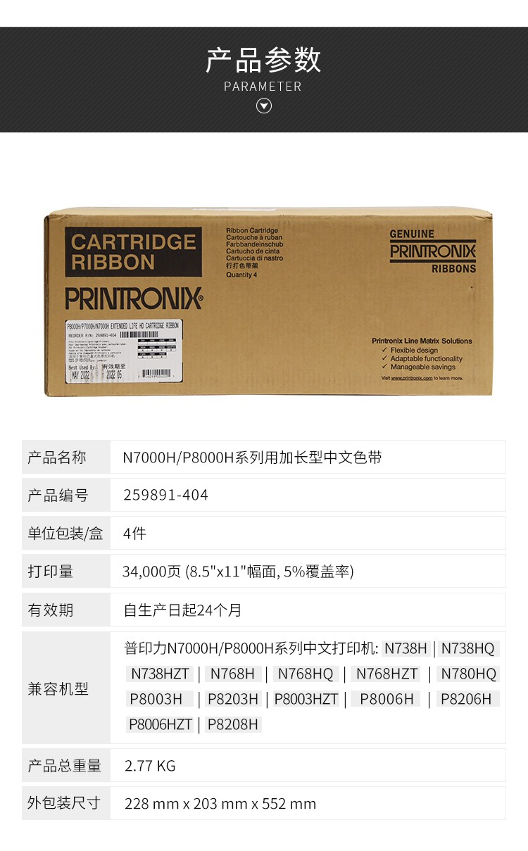 普印力PRINTRONIX 原装N7H/P8H系列中文色带色带框 259891-404加长版