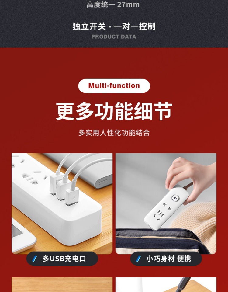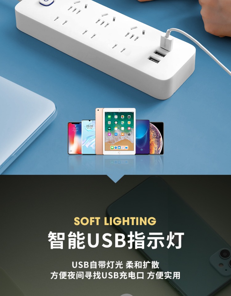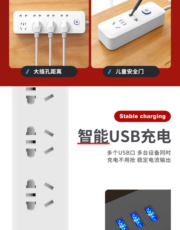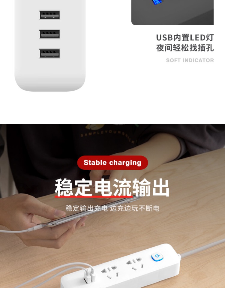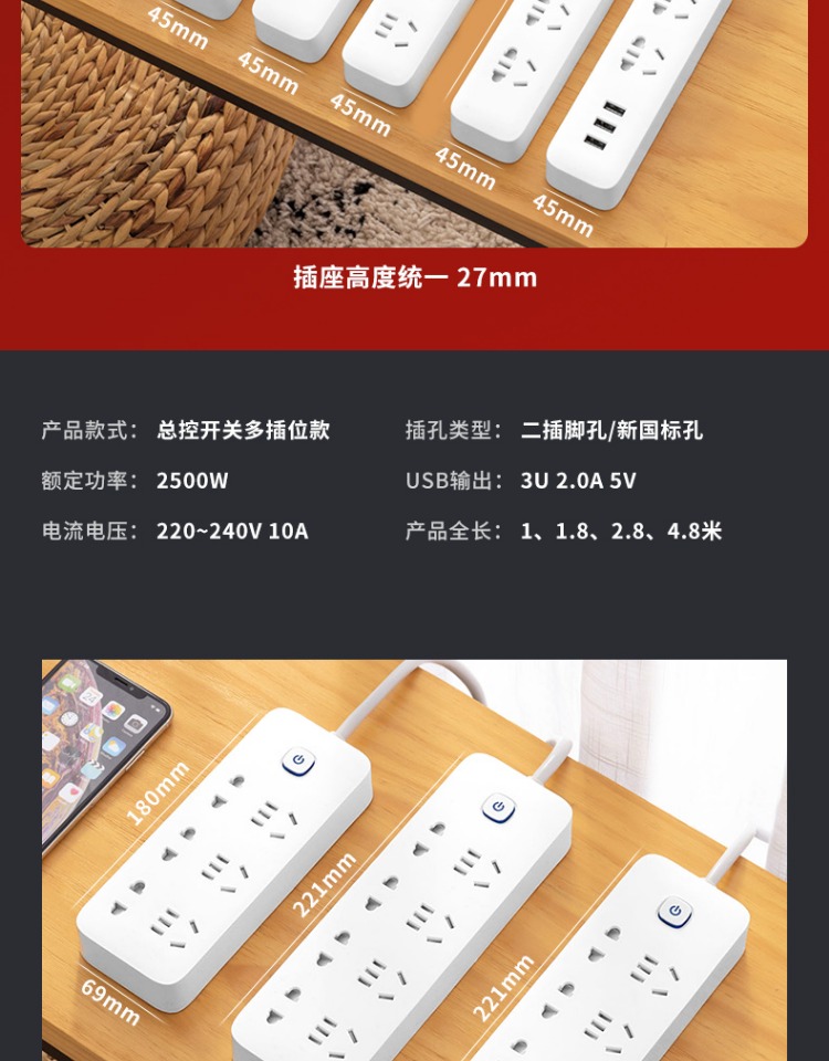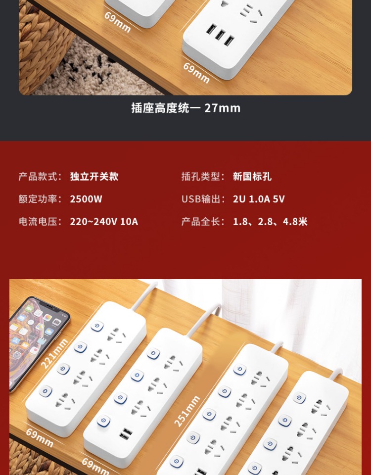 印典多功能拖线板6孔3USB 1.8米接线板
