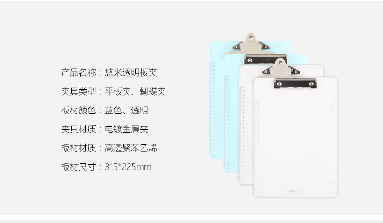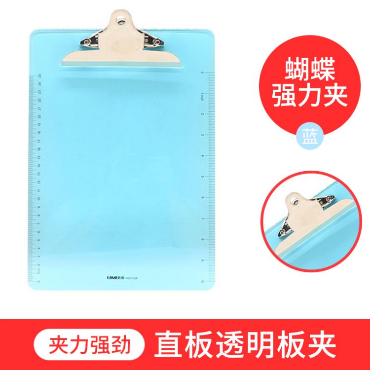 悠米(UMI)透明塑胶板夹,A4,蝴蝶夹 W05104B 蓝