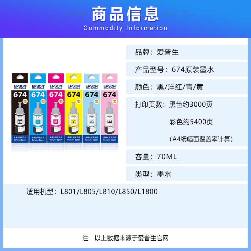 爱普生原装674墨水L801 805 810 850 1800打印机墨盒 674 红色墨水 原装 墨水