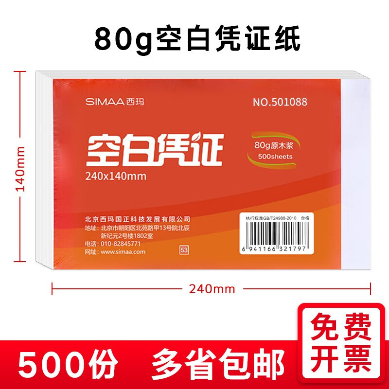 西玛表单80g增票大小空白凭证纸240*140mm加厚501088-80g(500份/包)