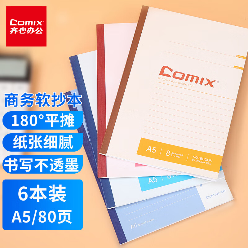 齐心(Comix)6本/A5/80张无线装订软抄本笔记本子/办公记事本学生本子开学文具 C4506