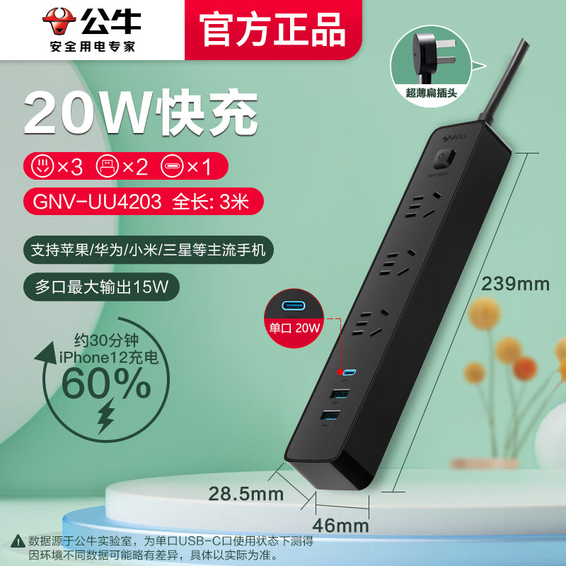 公牛USB拖线板总控3插位PD20W快充【3米UU4203黑】
