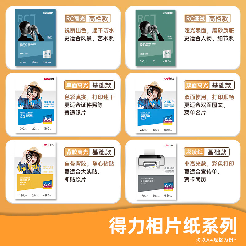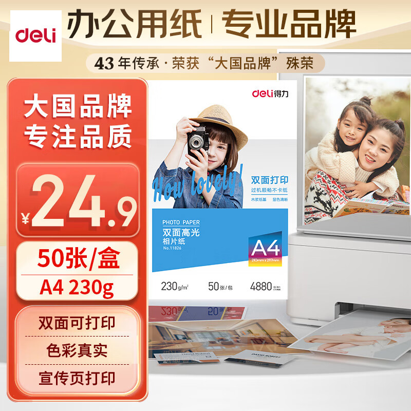 得力(deli)A4 230g双面高光照片纸 相片打印纸 50张/盒 11826