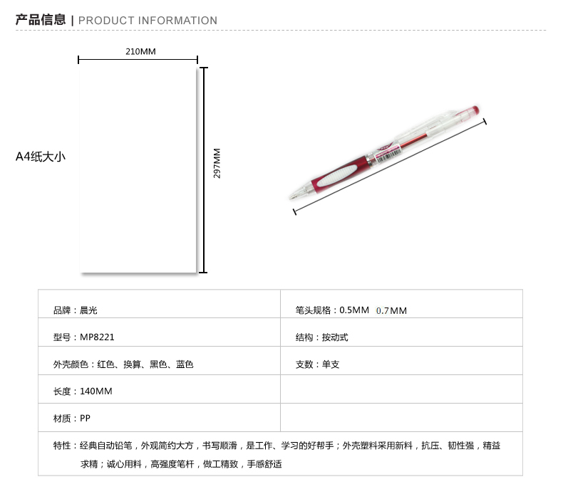 晨光(M&G)MP8221A(黑)自动铅笔0.5