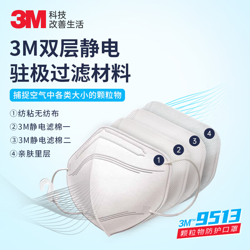 3M口罩9513轻型N95立体KN95防沙尘防飞沫颗粒物防雾霾PM2.5 一盒25个