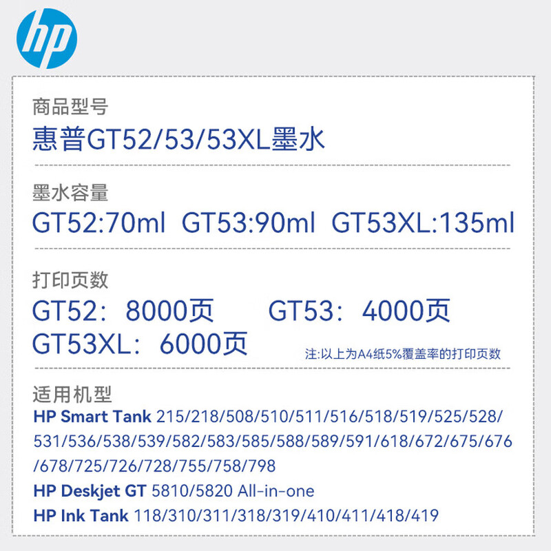 惠普(HP)GT53XL 52墨水原装511 518 519 538 618 510 531 516 GT53XL+GT52四色墨水套装(内包)