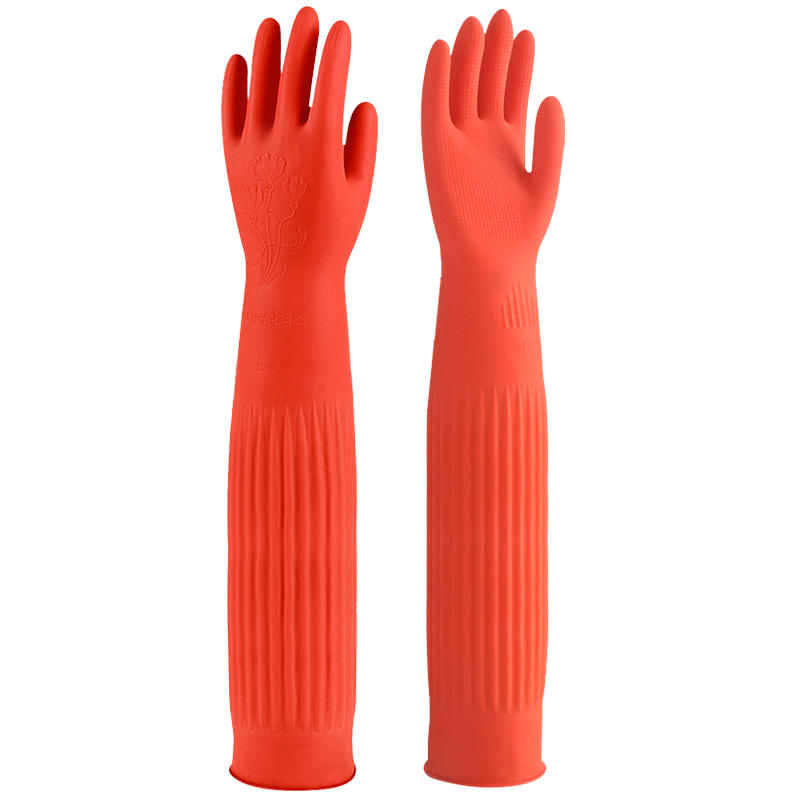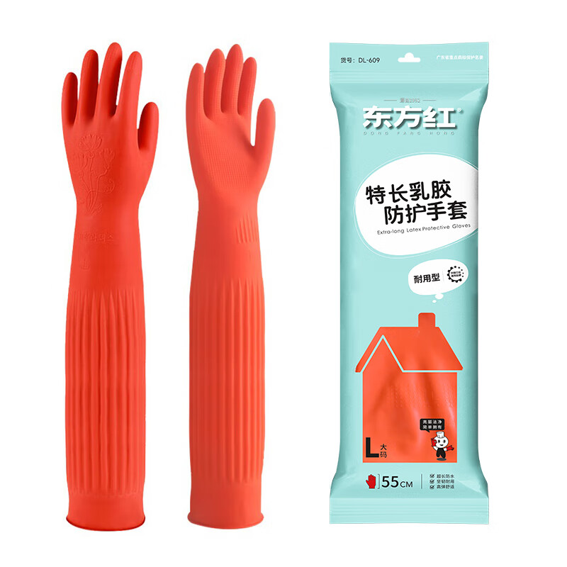 东方红 55CM橡胶手套加长袖防水耐用胶皮厨房保洁清洁洗衣加厚耐油污 1双装(红色)【京仓发货】 M码